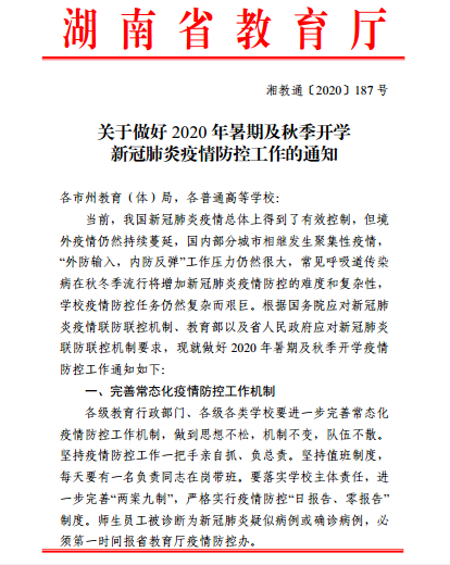 现将湖南省教育厅《关于做好2020年暑期及秋季开学新冠肺炎疫情防控工作的通知》(湘教通〔2020〕 187 号)转发给你们,请遵照执行。