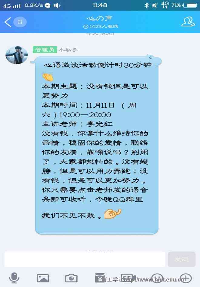 心语微谈是一种在线的实时互动问答活动,活动分为老师主讲和互动提问两种形式,在活动中老师和学生围绕着一个主题进行深入的交流与沟通。本活动共举办六期,主题包含了 “谁的青春不迷茫 ” 、“遇见最好的自己” 、“爱要怎么说出口 ” 、“没有钱,但我可以更努力” 、“ 大学校园—遍地狗粮” 、“学习”呼叫转移。