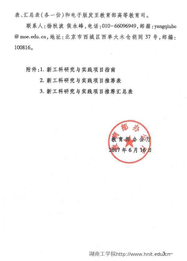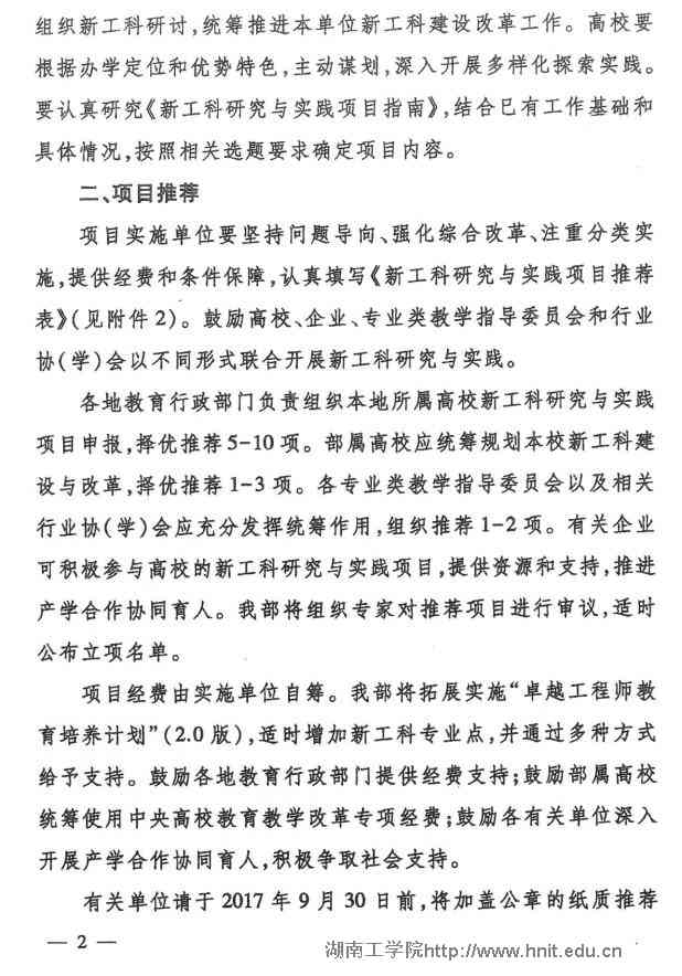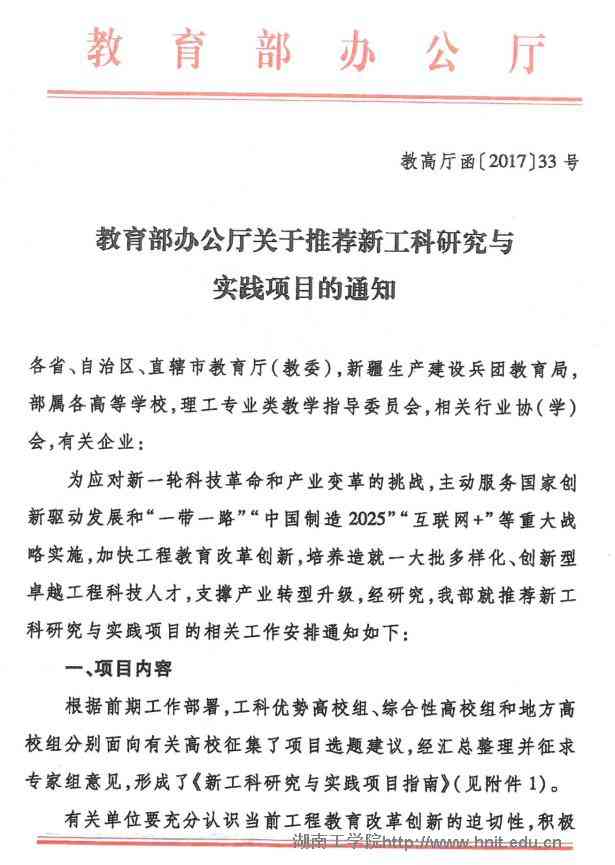 现将省教育厅《转发教育部办公厅关于推荐新工科研究与实践项目的通知》(教高厅函〔2017〕33号)转发给你们,并就我校项目申报有关事项通知如下: