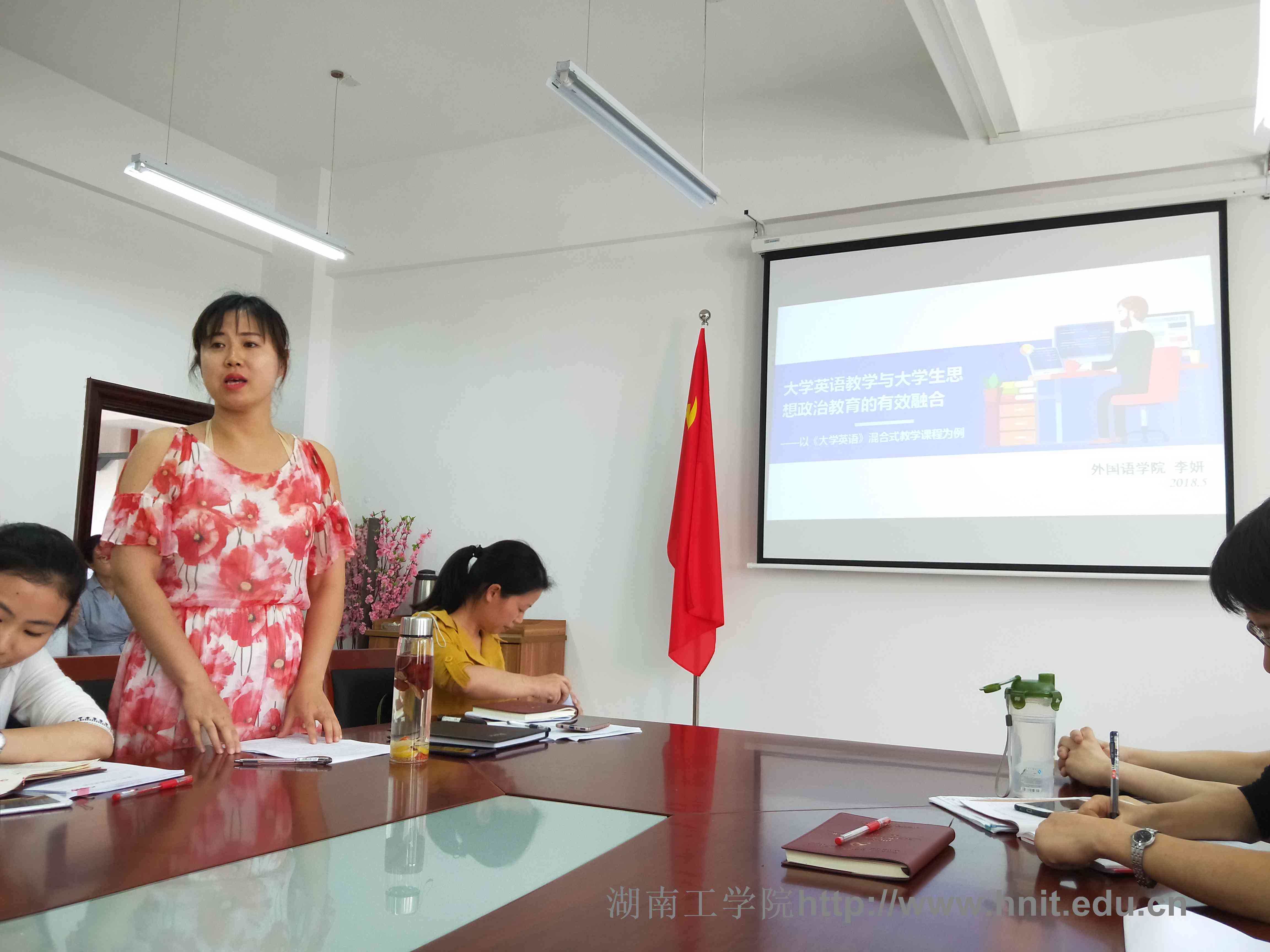 大学英语教研室支部陈晓波同志结合近五年大学英语教学情况,提出大学英语教师能在相对稳定且相对长的教学时段内,面向相对较广的学生开展教书育人的工作。并分享了大学英语教师们在教学内容、教学形式和教学评价三方面的以文化人、以良好的示范性和强烈的责任心做到以德育人的工作状态和实绩。大英教研室教师李妍则以《大学英语》混合式教学课程为例,深入浅出的分享了自己如何将“立德树人”融入大学英语课程教学。