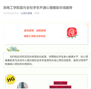 为积极应对新型冠状病毒肺炎疫情,缓解学生焦虑情绪,保障我校学生身心健康,校心理健康教育与咨询中心自21日起面向全体学生提供在线心理咨询服务,在线值班时间为每天上午9:00-11:30,下午14:30-17:00,晚上19:00-21:00三个时间段,在线服务过程严格遵循心理咨询伦理原则。截止目前,心理咨询中心共接待网络咨询10余人。此外,心理健康教育与咨询中心也通过微信公众号心成长部落定期推送心理抗知识,为学生的心理健康保驾护航。