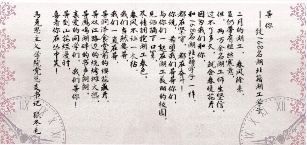 再次感谢你们的来信和问候!全体湖工人都在关心你们、支持你们、鼓励你们。正如你们在信中所讲的:“万众一心,没有翻不过的山;心手相牵,没有跨不过的坎。”我们坚信,只要我们携手并肩,砥砺前行,就一定能早日取得战疫胜利!期待春暖花开之时,我们在美丽的湖工校园重聚!