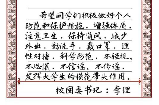 疫情发生以来,党中央和国务院高度重视,习近平总书记就防控工作多次作出重要指示,李克强总理就防控工作出系列部署,湖南省也率先启动了重大突发公共卫生事件一级响应,学校也迅速成立了疫情防控工作领导小组,积极行动,举全校之力做好疫情防控工作,目前全校教职员工、同学平安,校园内消毒杀菌,为同学们准备好一个安全的学习生活环境。希望同学们一定始终坚定信心,保持定力,积极响应国家的号召,努力学习防控知识,提高安全防范意识,做好科学防范措施,并与学校保持密切联系。学校将竭尽全力、第一时间为你们提供必要的帮助,共同打赢这场疫情防控狙击战。