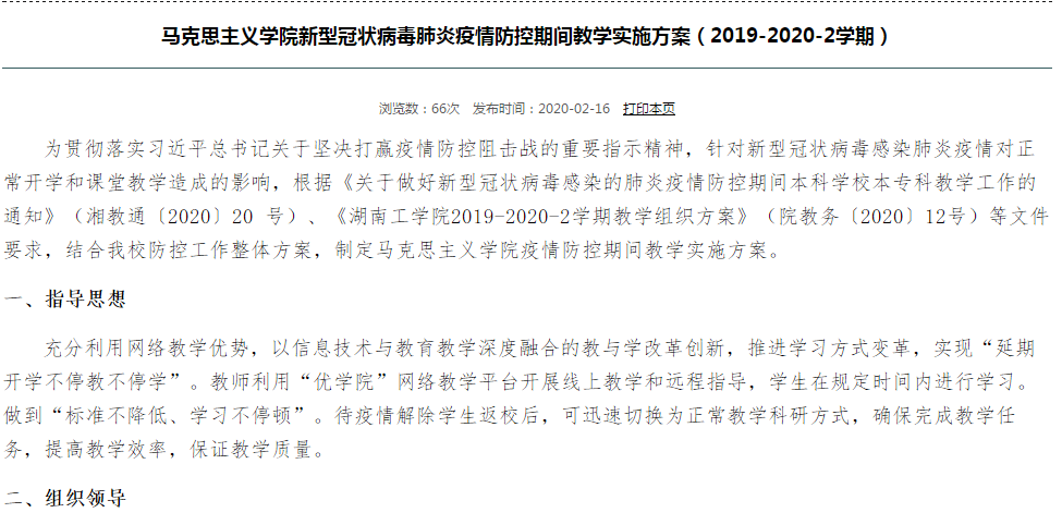 金沙990线路检测马克思主义学院接到湖南省教育厅《关于做好新型冠状病毒感染的肺炎疫情防控期间本科学校本专科教学工作的通知》(湘教通〔2020〕20 号)、《金沙990线路检测2019-2020-2学期教学组织方案》(院教务〔2020〕12号)等文件以后,结合学校防控工作整体方案,在全校率先制定疫情防控期间在线教学实施方案,确定了“标准不降低、学习不停顿”的教学原则,提出了“平台资源+在线指导+学思结合”的教学模式,拟定出依托“优学院”网络教学平台为主的方案,为学校摸清思政课在线教学的基本情况提供了重要参考经验。