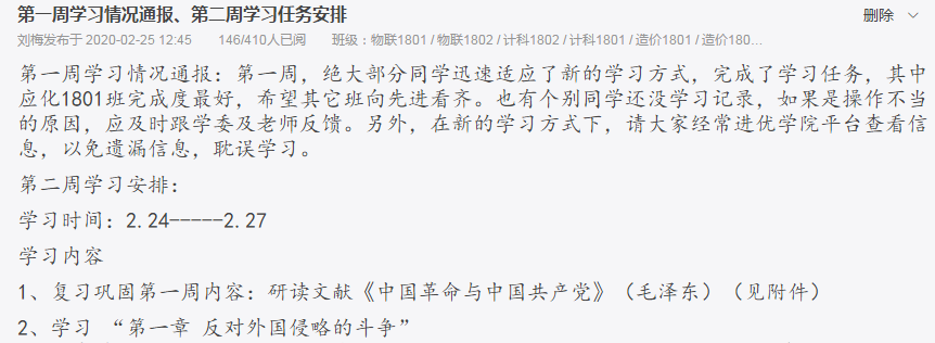 因时间紧迫,“纲要”、“原理”、“基础”、形势与政策等思政课主干课程开课宜早不宜迟。因此,马克思主义学院果断地制定了推进在线教学的时间进度表,要求各承担2019-2020第二学期的教学任务的老师以教务处下达的班级和课表为对象,通过启动教学平台、建立班委微信、qq群联系学生,确保2月19日准时、全面开学开课,为全校线上教学起到了良好的带头作用。