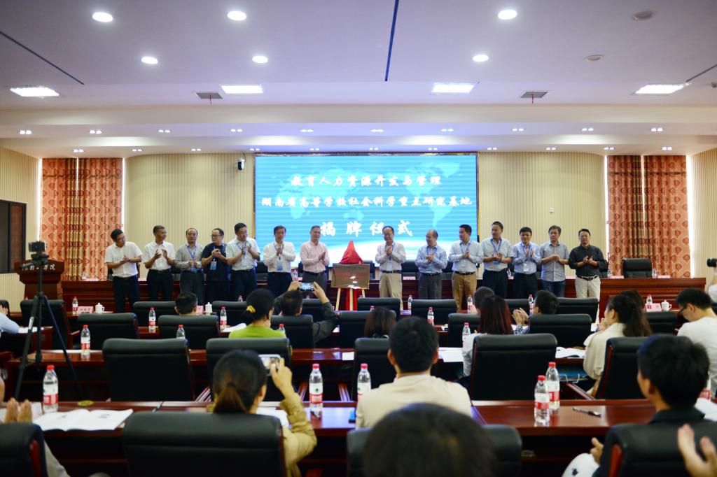 开幕式后,现场专家学者共同参与我校教育人力资源开发与管理湖南省高等学校社会科学重点研究基地揭牌仪式。