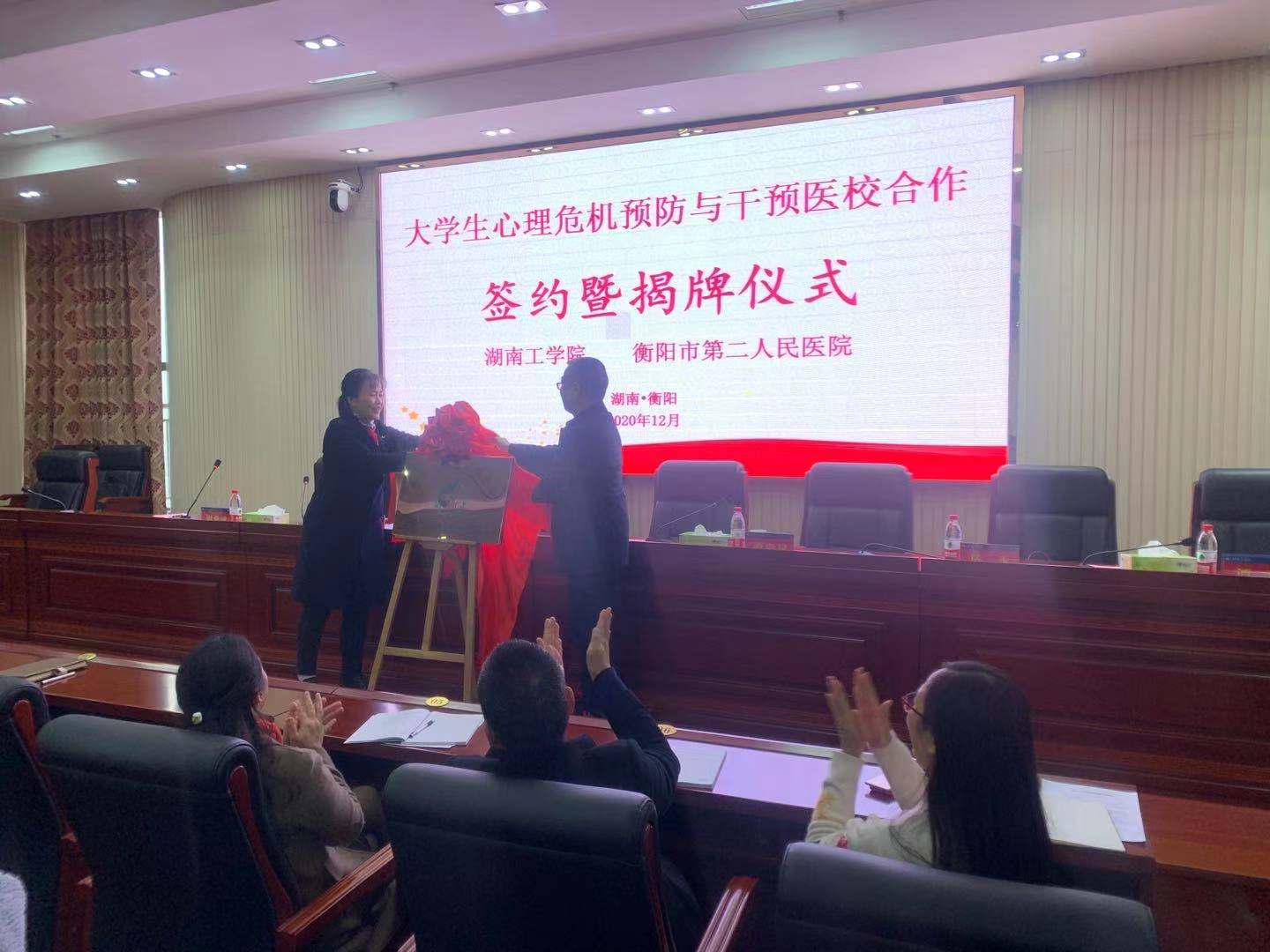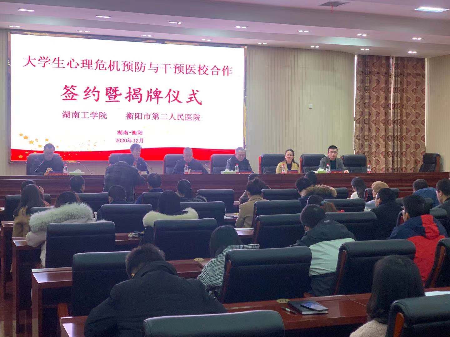 为提升学生心理素质,健全心理服务体系,12月2日,我校与衡阳市第二人民医院在教学大楼12楼报告厅举行大学生心理危机预防与干预医校合作签约暨揭牌仪式。仪式由学工处副处长周燕斌主持,学工处处长李文珊、衡阳市第二人民医院相关负责人、各二级学院党委副书记、学工办主任、全体辅导员、心理中心全体人员出席活动。