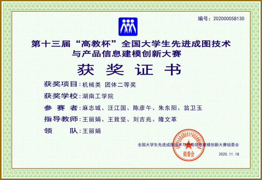 近日,第十三届“高教杯”全国大学生先进成图技术与产品信息建模创新设计决赛在南昌航空大学举办。在机械类350多个队伍中,我校机械工程学院参赛团队以总分第58名的成绩获得团体二等奖,个人单项一等奖13项,二等奖3项,三等奖1项,优秀指导教师二等奖4项,在湖南省机械类参赛队中名列前茅。