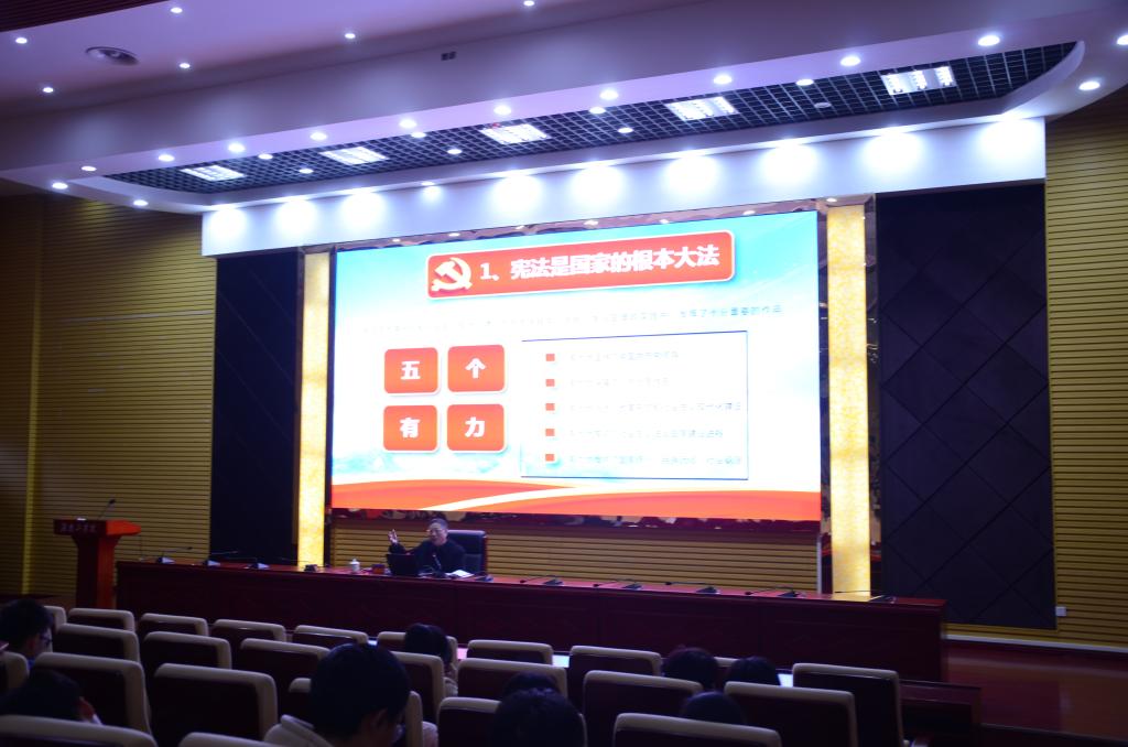 谢国保教授讲授的专题是“弘扬宪法精神、深化依法治国”。在近两个小时的授课中,他紧密结合党的十九大报告中提出的全面依法治国是新时代中国特色社会主义的基本方略的新定位的重要论述,围绕宪法在治国理政中的重要地位和作用、我国宪法的发展进程、2018宪法修改的背景、主要内容和维护宪法权威、捍卫宪法尊严、保证宪法实施等4个方面进行了深入阐释与解读,为学生讲授了一堂深刻而生动的《形势与政策》课。