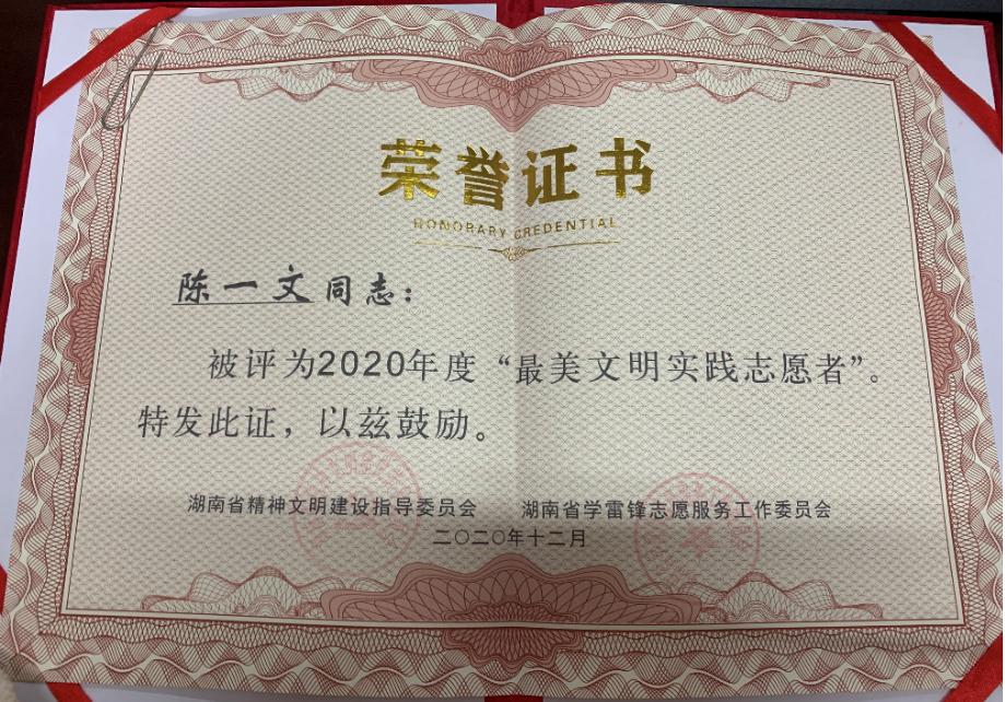 近日,湖南省精神文明建设指导委员会、湖南省学雷锋志愿服务工作委员会下发了关于表彰湖南省2020年文明实践志愿服务先进典型的决定,我校学生工作处陈一文获得“最美文明实践志愿者”的荣誉称号。
