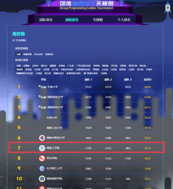 在4月24日举行的“2021中国高校计算机大赛-团体程序设计天梯赛” 中,我校派出3支队伍共30位学生与来自全国包括北京大学、浙江大学、国防科技大学、中南大学等347所高校的1100支队伍共10946学生同台竞技。近日,最终成绩揭榜,我校取得湖南省高校总榜第7名,全国第149名的历史最佳成绩。相比往年,实现了“五项突破”,其一是首获湖南省高校三等奖;其二是首次拿下全国团队三等奖;其三是胡梦泽、罗洪2名同学斩获全国个人银奖;其四是首次获得湖南省团队二等奖;其五是获奖数量的突破,共获得4项集体奖,8项个人奖,在同类院校中名列前茅。