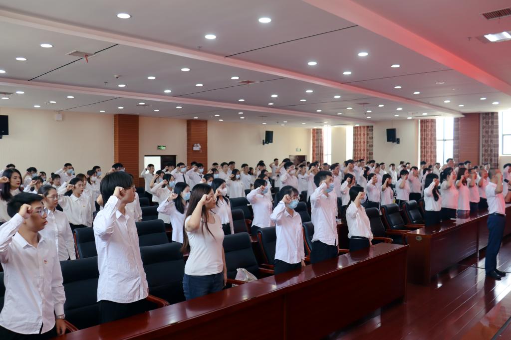 根据中央和上级党组织关于开展“永远跟党走”群众性主题宣传教育活动有关部署,6月22日下午,学校在教学大楼12楼报告厅举行2021年新党员入党宣誓仪式。全校115名新党员代表面对党旗高举右手、庄严宣誓,党委副书记张平出席仪式并上微党课,党委组织部常务副部长杨朗领誓。仪式由党委组织部副部长叶正明主持。