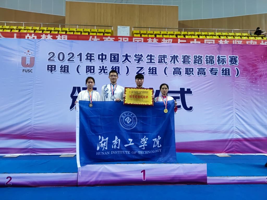 2021年中国大学生武术套路锦标赛于7月5日至8日在河北唐山九江体育馆盛大举行!我校龙身蛇形太极拳队在领队体育教学部党总支书记余忠,教练王芝琴、李园园的带领下,4名精英队员奔赴赛场。经过三天激烈角逐,我校经济与管理学院工商1903班冯燕盈和建筑工程与艺术设计学院工程造价1902班张星雨分别获女子甲A组龙身蛇形太极拳冠军和季军,建筑工程与艺术设计学院工程造价1803班谭宇鹏荣获男子甲A组龙身蛇形太极拳亚军。我校获得“体育道德风尚奖”。