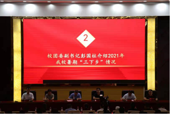 仪式首先通过宣传视频简要回顾了我校近年来暑期“三下乡”取得的显著成就。省级重点团队负责人崔龙娇同学和重点团队指导老师任长安教授作为参加实践的青年学生和指导教师代表分别做了表态发言。校团委副书记彭国柱介绍了今年暑期“三下乡”社会实践活动的总体情况,从组织纪律、安全保障、宣传推广等方面对社会实践活动提出了要求。