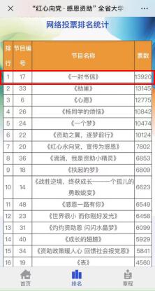 据悉,为参与本次比赛,我校积极组织,动员各学院广泛参与,经学院推荐、团队自荐等方式共收到参赛作品35项。本次比赛中,共有50个作品成功入围复赛,我校作品《一封书信》入围复赛后进入网络投票环节,并最终以13920票的绝对优势斩获全省网络投票第一名。(学生工作部(处)、武装部)