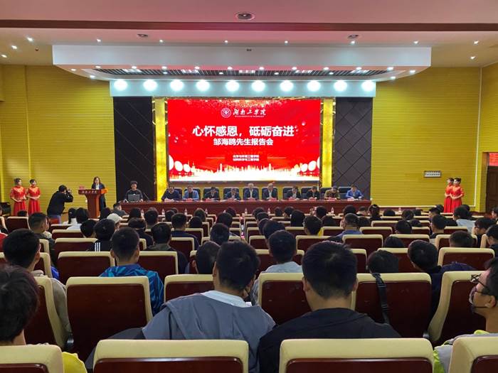 10月29日上午,化学与环境工程学院在500人报告厅举办“心怀感恩,砥砺奋进”邹海鸥先生报告会暨2021级新生教育大会。校党委副书记张平、校友总会办公室主任贺旭、学工处(武装部)处长曹毅、副处长刘赢时、化学与环境工程学院和材料科学与工程学院相关负责人、教师代表、学院学生会和分团委学生干部、全体2021级新生参加。报告会由化学与环境工程学院党委副书记蔡玲主持,材料科学与工程学院党委书记刘湘欣致欢迎辞!
