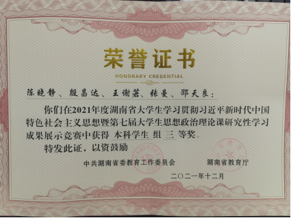 近日,从省教育厅《关于公布湖南省大学生学习贯彻习近平新时代中国特色社会主义思想暨第七届大学生思想政治理论课研究性学习成果展示竞赛结果的通知》(湘教通2021[359] 号)文件获悉,由我校环境2001班陈晓静等五位同学组成的思想政治理论课研究性学习小组荣获本科组三等奖,指导老师伍小乐荣获优秀指导老师,我校荣获优秀组织奖。