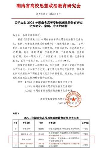 据悉,湖南省高等学校思想政治教育研究会下发《关于表彰2021年湖南省高等学校思想政治教育研究优秀论文、案例、专著的通报》,全省共评选产生优秀专著20部,我校学工系统理论成果《立德树人 引路铸魂——高校辅导员工作基础理论与实务》获评湖南省高校思想政治教育研究优秀专著三等奖。