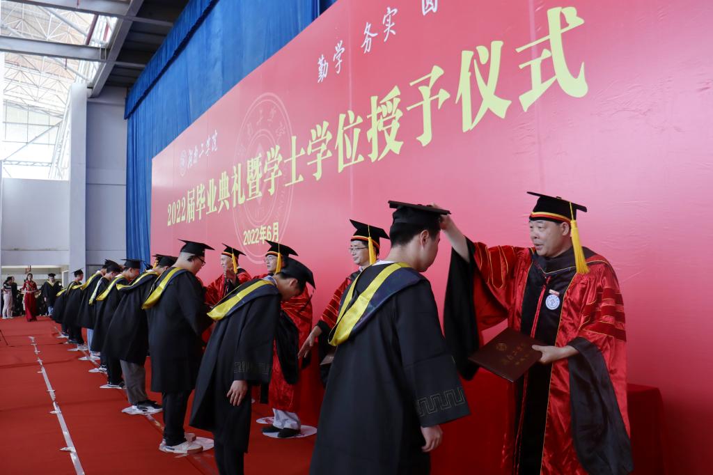 栀子花开,离歌响起,6月2日,学校在体育馆为即将离校的5000余名2022届毕业生举行隆重的毕业典礼暨学位授予仪式。全体校学位评定委员会成员为毕业生拨穗正冠,授予学位证,2022届毕业生们在毕业典礼暨学士学位授予仪式签名墙上留下自己的名字,为他们四年大学求学岁月画上圆满句号。典礼由校党委书记宋克慧教授主持。