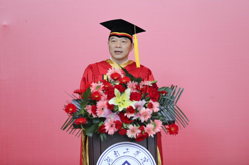 校长、校学位评定委员会主席曹执令教授以《担当》为题发表致辞,深情寄语2022届毕业生,为他们讲授毕业前的最后一课。他围绕“什么是担当”“青年人为什么要有担当”“新时代青年要怎么去担当”,向同学们阐述了担当的内涵要义及时代价值,勉励同学们忠于祖国,志存高远,努力做新时代具有远大理想和坚定信念的爱国者;砥砺奋进,敢于担当,努力做新时代具有责任意识和创新精神的建设者;勤练本领、善于担当,努力做新时代具有过硬本领和高尚品格的接班人。“奔跑吧!让我们一起向未来!”,他最后说道,责任承载梦想,担当成就未来。时代的接力棒已经传递到了当代青年手中,实现第二个百年奋斗目标,亿万青年是见证者,更是参与者。新征程上,青年奋斗者当以青春挺立潮头、以担当勇挑重任、以拼搏逐梦圆梦,争做堪当民族复兴大任的时代新人,在青春的赛道上跑出当代青年的最好成绩。