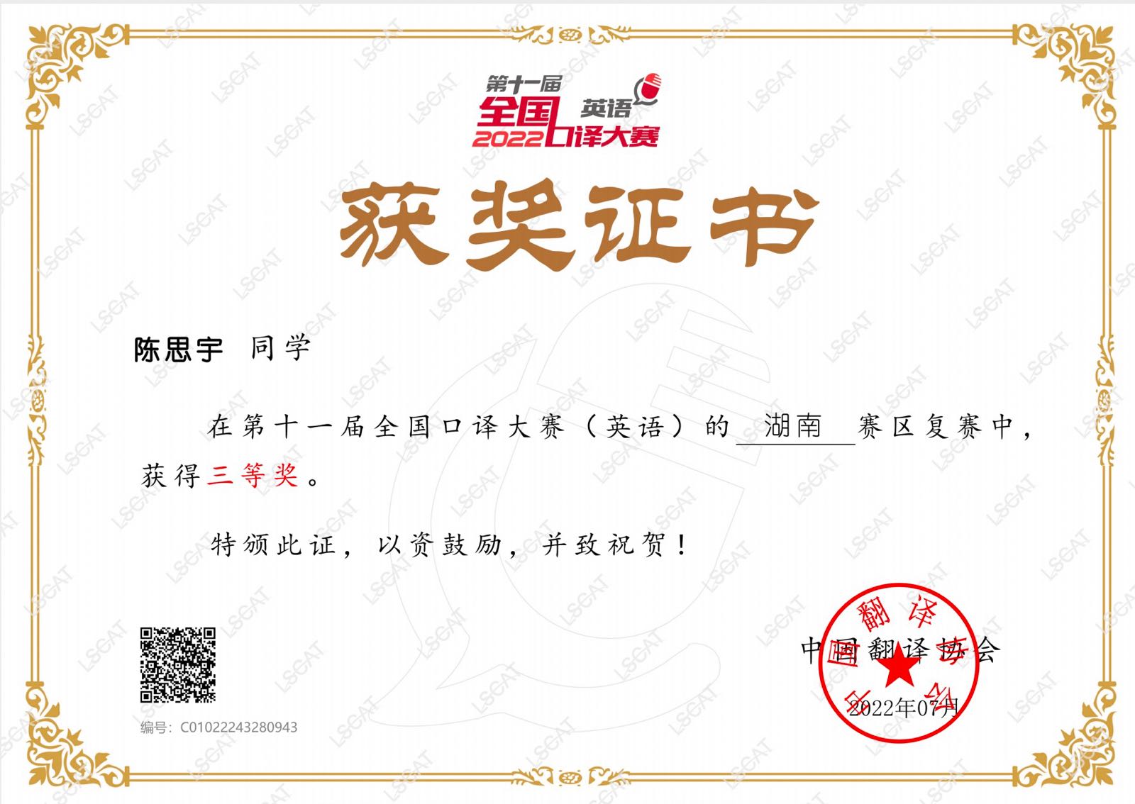 7月15日,由湖南工商大学承办的的第十一届全国口译大赛(英语)湖南赛区复赛获奖名单公布。本次大赛在线上举行,不分本科组及研究生组,以口译实力一分高下。选手需在规定时间内完成英译汉与汉译英的比赛。赛题涉及话题广泛,对选手的领域知识储备、汉英双语水平以及心理素质都提出了较高要求。经过专家评委的评审,我校外国语学院商务英语专业周思怡(指导老师:陈柯)、付凯晴(指导老师:陈柯)两位同学,分别以全省排名第9、第10,荣获湖南赛区一等奖,翻译专业陈思宇同学(指导老师:严玉婷)获三等奖;三位选手晋级中部大区赛(湖南、湖北、河南、江西)。这是我校自2012年起参加全国口译大赛省级复赛,第一次取得一等奖的好成绩。