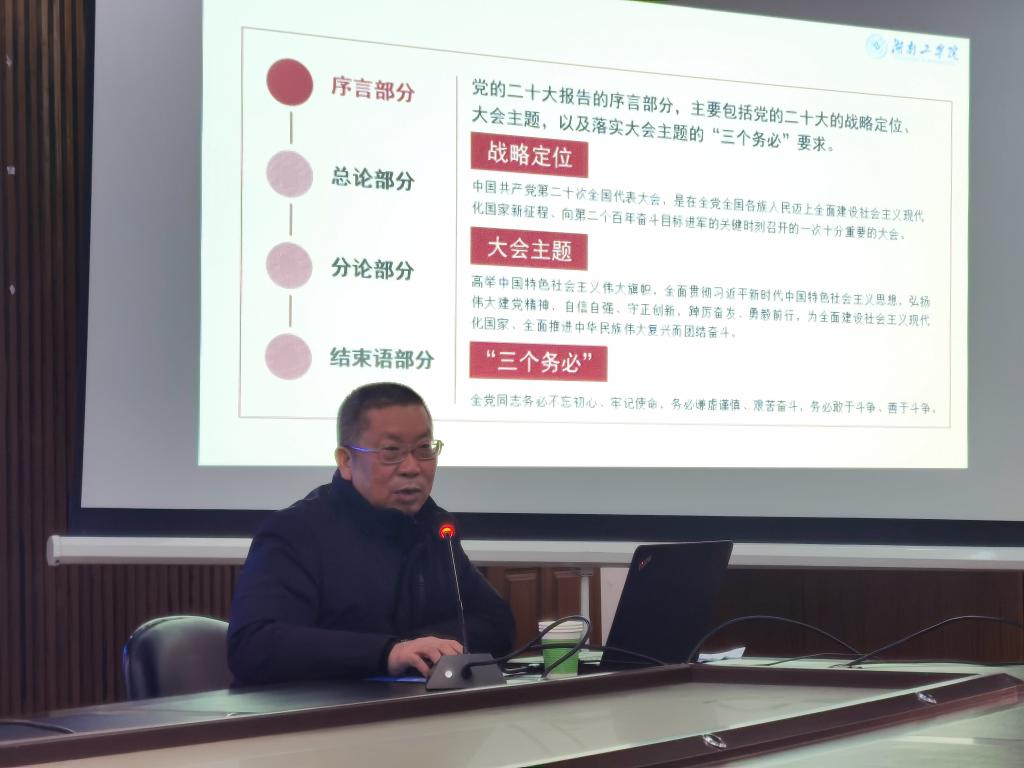 刘龙昌以《新时代新征程坚持和发展中国特色社会主义的政治宣言和行动纲领》为题,从深刻认识党的二十大重大意义、深刻领会党的二十大的主题、过去5年工作和新时代10年的伟大变革、习近平新时代中国特色社会主义思想的世界观和方法论、新时代新征程中国共产党的使命任务、中国式现代化的中国特色和本质要求、党和国家事业的重大部署和新要求等方面,对党的二十大精神作了系统讲解和深入阐释。他指出党的二十大报告,主题鲜明、思想深邃,内涵丰富、博大精深,是一篇闪耀着马克思主义真理光芒的纲领性文献,通篇展示了以习近平同志为核心的党中央引领强国复兴伟业的宏图大略和伟大创造,我们必须深刻学习领会。