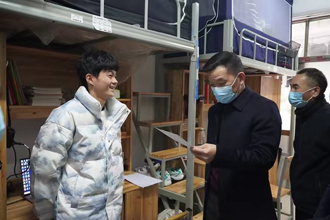 走访过程中,曹校长与同学们亲切交谈,深入了解学生生活及复习迎考准备等情况,悉心询问是否还有其他困难需要学校帮助和解决,叮嘱同学们在寒冷天气要注意保暖和用电安全,提醒同学们严格遵守疫情防控工作要求,当好自身健康第一责任人。他鼓励大一新生做好职业生涯规划,提高综合能力;叮嘱不按时吃饭的同学,加强时间管理、养成良好的学习和生活习惯;关心毕业班同学的升学和就业情况;挂念路途遥远的同学们是否能够平安返乡。在宿管员值班室内,曹校长查看了辅导员下宿舍情况,指出学生工作者要抓牢宿舍育人阵地,及时回应学生诉求,做好学生的知心人、热心人、引路人。走访结束后,曹校长对安工学院领导老师强调要坚持以学生为本,用心、用情、用力做好学生工作,深入学生宿舍解决实际困难,深入学生班级解决思想困惑,深入学生心理关注身心健康,助力学生成长成才。
