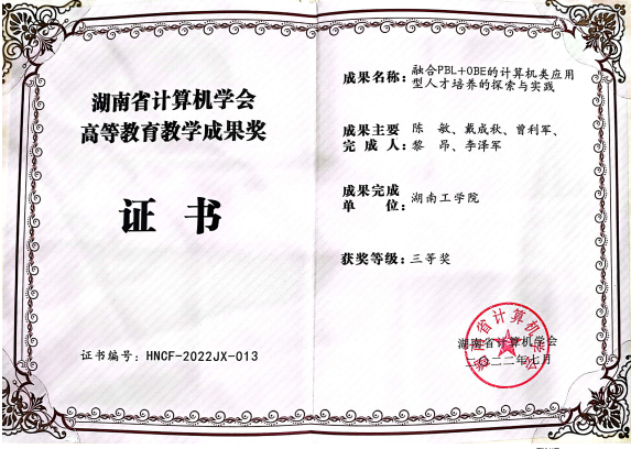 “融合PBL+OBE的计算机类应用型人才培养的探索与实践”获湖南省计算机学会高等教育教学成果奖