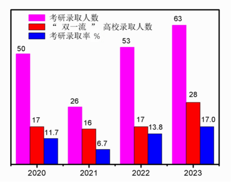 近日,随着2023年全国硕士研究生招生录取工作接近尾声,材料科学与工程学院考研录取率刷出新高,学院共有63名学生被录取,占报考人数的57.8%,占毕业生总人数的17.02%,较去年高出3.22个百分点。其中28名学生被“双一流”高校录取,占录取人数的44.4%。
