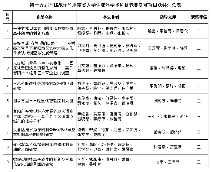 我校学子在第十五届“挑战杯”湖南省大学生课外学术科技作品竞赛中获奖