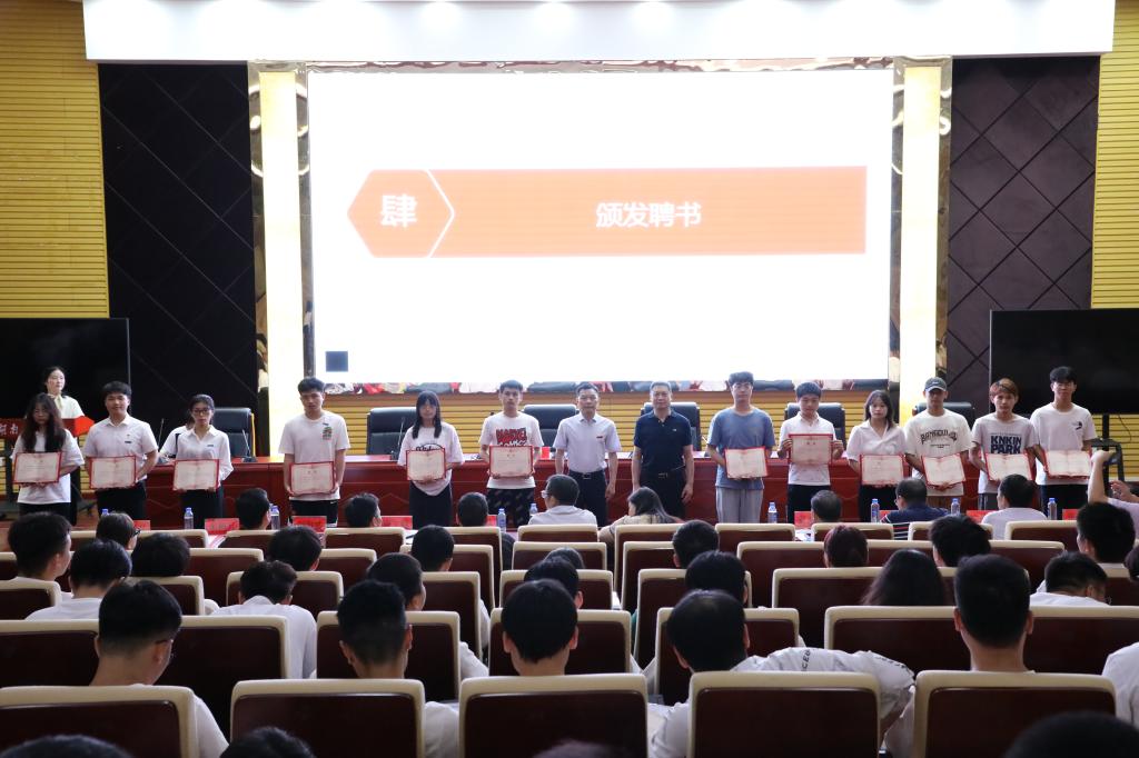 在校友联络员聘任仪式中,教育基金会主任米梅月宣读《金沙990线路检测校友联络中心关于聘任2023届校友联络员的决定》,曹执令、罗建华为121名校友联络员颁发了聘书。