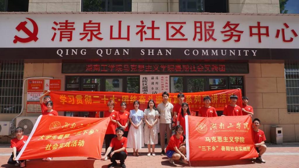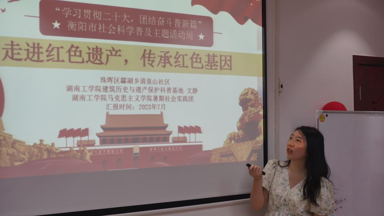 为深入学习宣传贯彻党的二十大精神,推动社会科学普及活动持续深入开展,7月5日上午,我校设计艺术学院建筑历史与遗产保护科普基地负责人文静老师率领团队成员与马克思主义学院暑期社会实践团赴清泉山社区开展衡阳市社会科学普及主题活动周和“学习贯彻二十大·团结奋斗谱新篇”系列宣讲活动。