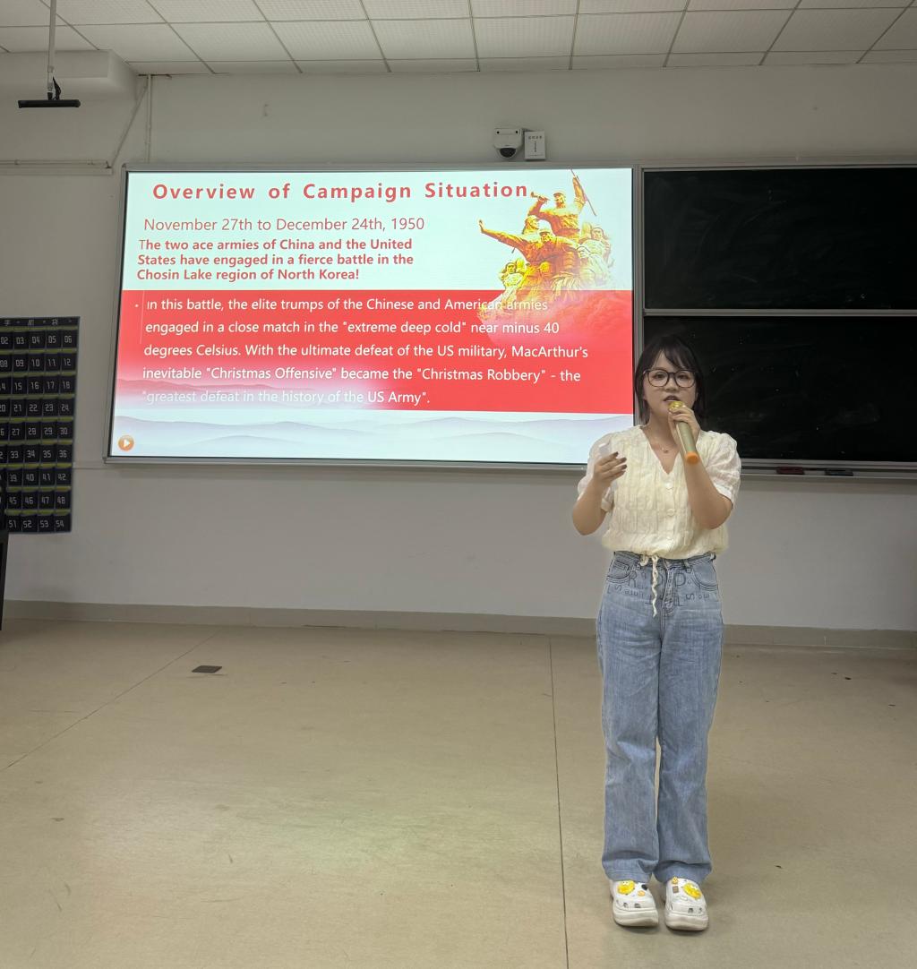 在师生齐颂红色经典读书分享环节,外国语学院日语专业老师霍辉英和英语专业教师张伟平分别用日语和英语与在座的同学们分享了《半条被子》的红色故事和《红岩》这本红色读书,既表达自己对党的无限忠诚、对祖国的无比热爱,又展现了外语专业教师的专业功底和教学能力。