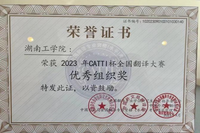 在由全国翻译专业学位研究生教育指导委员会和中国外文局翻译院联合主办的2023年“CATTI杯”全国翻译大赛中,我校获优秀组织奖,我校学生兰颖获中英笔译组个人二等奖。
