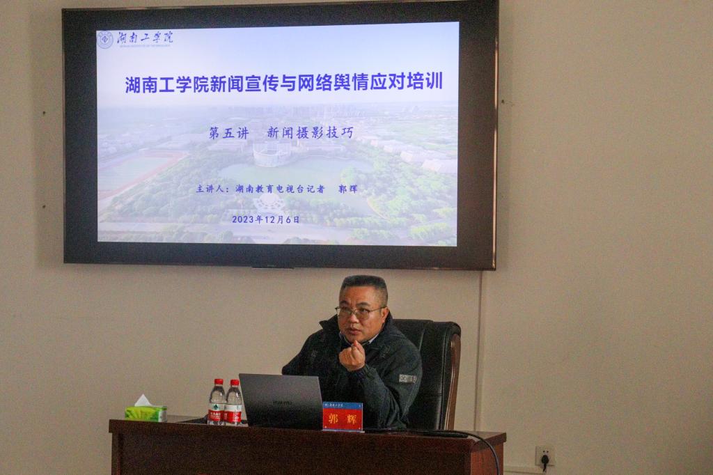 湖南教育电视台记者郭辉以“新闻摄影技巧”为主题。从“新闻思维”“摄影设备”“摄影摄像的技巧”三方面入手,结合丰富的事例,用提问互动的方式就如何提高新闻摄影能力为同学们上了一堂实用的摄影技巧课程。