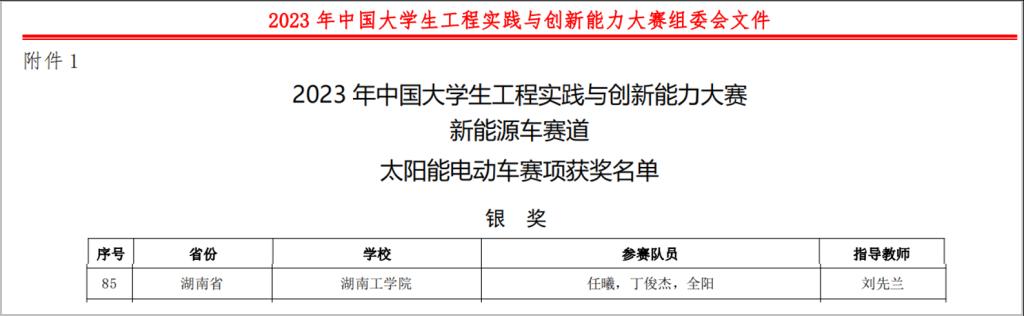 近日,大学生工程实践与创新能力大赛组委会公布了2023 年中国大学生工程实践与创新能力大赛总决赛名单,我校任曦团队设计的作品获得“新能源车”赛道“太阳能电动车”赛项国赛银奖。