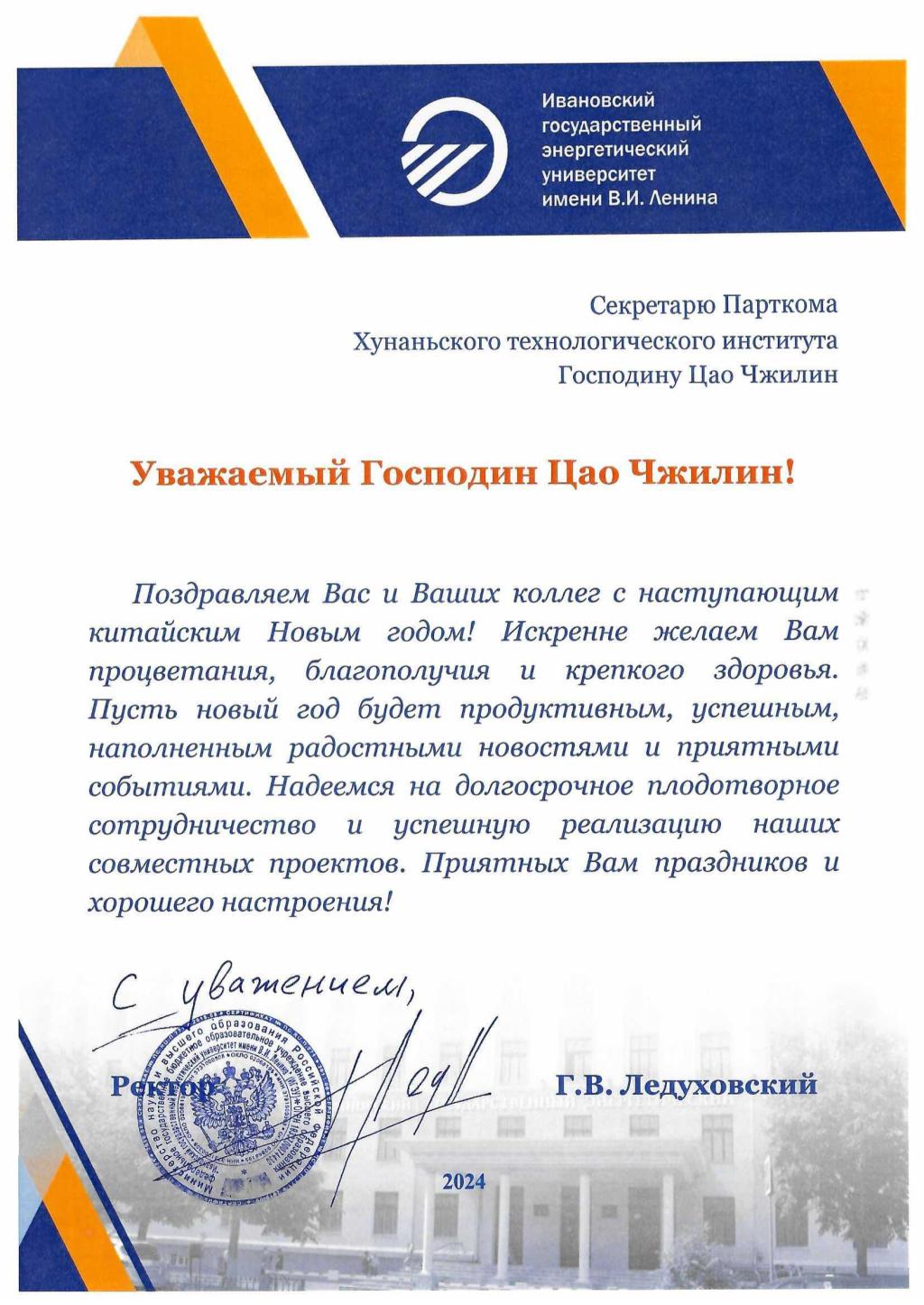 俄罗斯伊万诺沃国立动力大学向我校致新年贺信