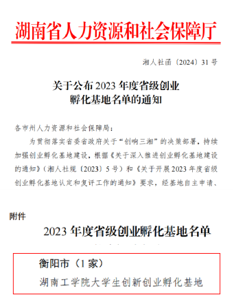近日,湖南省人力资源和社会保障厅发布《关于公布2023 年度省级创业孵化基地名单的通知》(湘人社函〔2024〕31 号),我校大学生创业园(创新创业孵化基地)成为2023年度衡阳市唯一被认定的省级孵化基地。