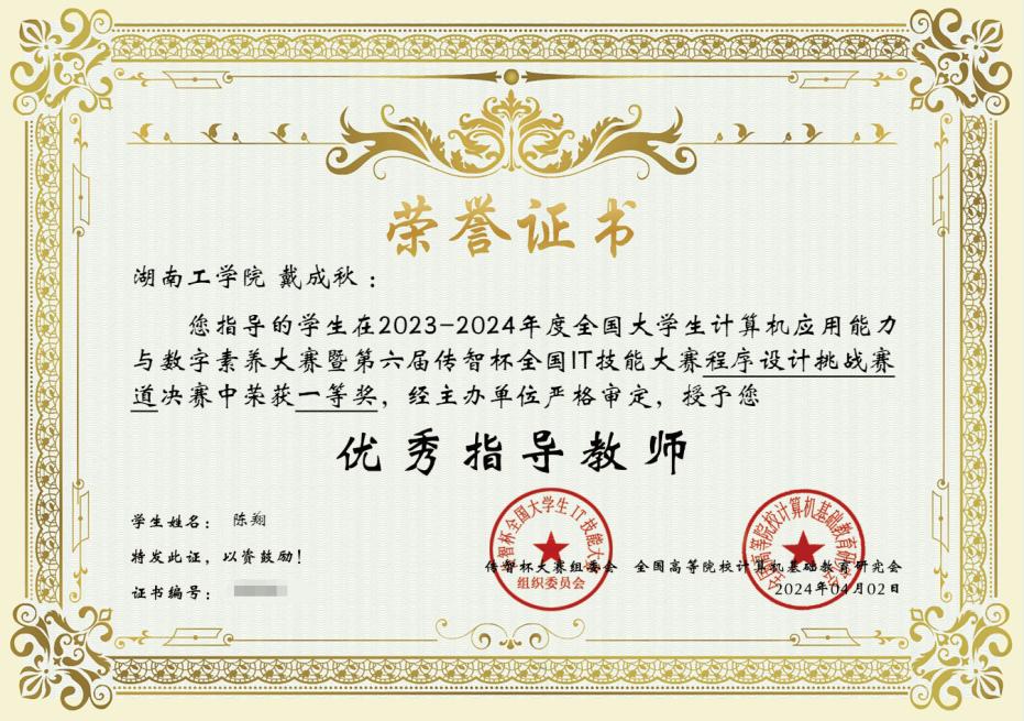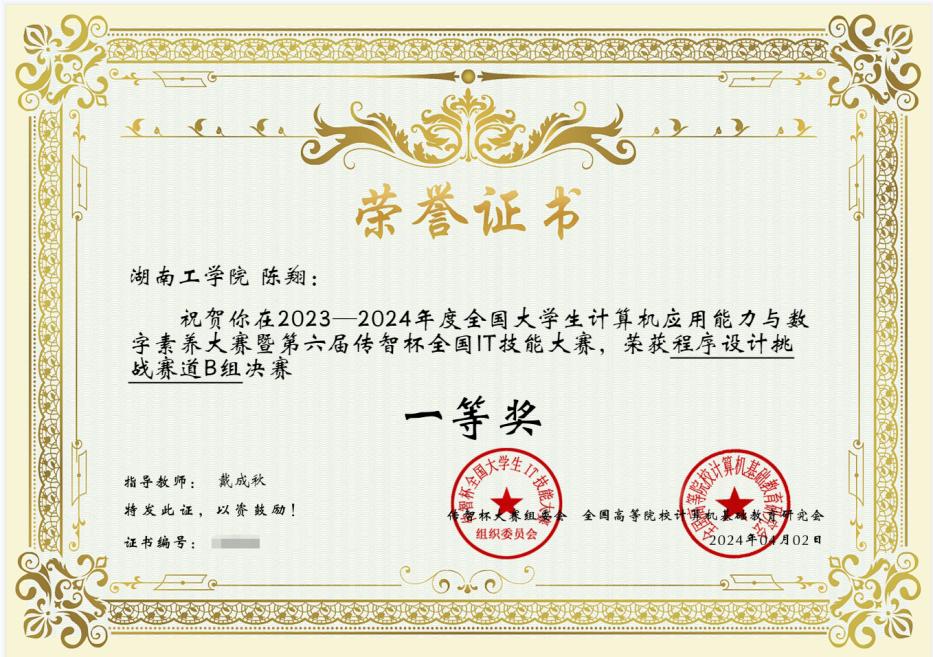 近日,计算机科学与工程学院的学子们在第六届传智杯全国IT技能大赛——程序设计挑战赛全国总决赛中,凭借卓越的表现取得了好的成绩。其中,计科2204班陈翔同学荣获全国一等奖,软件2202班王江和同学荣获全国二等奖,指导老师戴成秋荣获“优秀指导教师”。