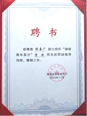 近日,湖南省科技厅下发聘书,聘请人因工程全国重点实验室主任陈善广教授担任我校安全与管理工程学院青年教师、2023年度湖南省芙蓉计划“湖湘青年英才”青涛的带培导师。