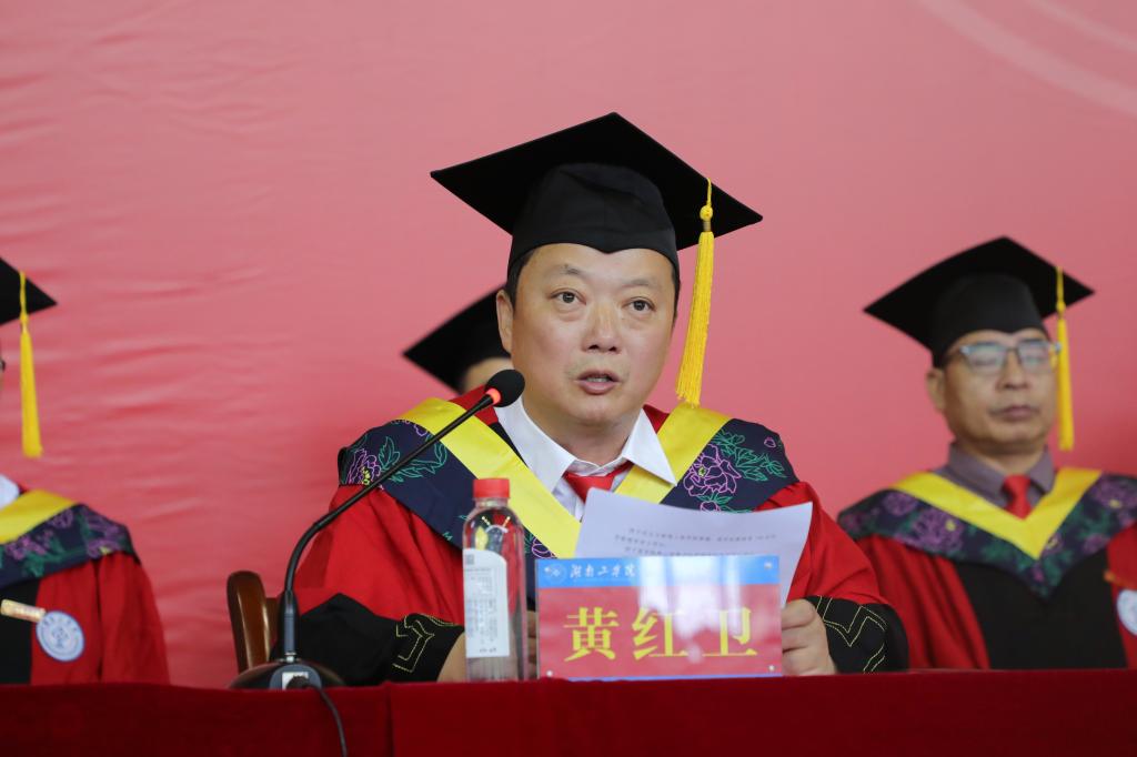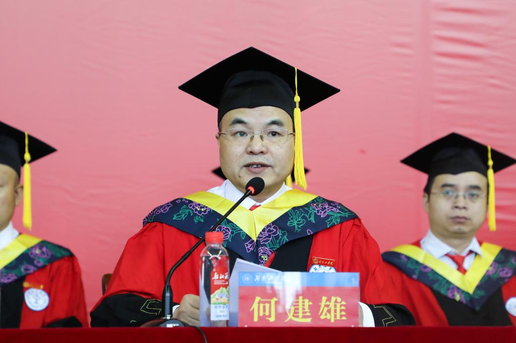 何建雄在主持典礼时寄语2024届毕业生,一要志存高远,胸怀天下;二要心怀感恩,情系湖工;三要脚踏实地,奋发有为。在新的征程上用青春的能动力和创造力书写出属于自己的人生答卷。