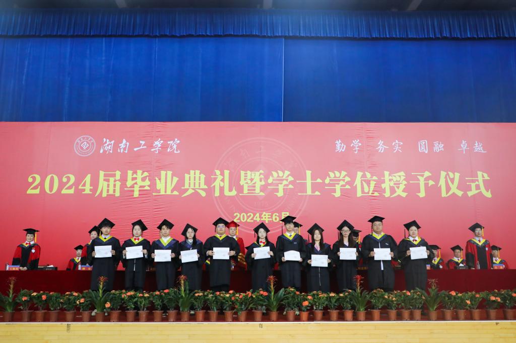 在欢快的音乐声中,校领导为湖南省普通高校优秀毕业生代表颁发荣誉证书,并为毕业生们颁授学位证书,扶正流苏。