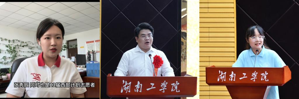 2023年西部计划志愿者、现服务于新疆生产建设兵团的外国语学院商务英语专业1903班张秀辰同学通过视频分享了自己服务的体验与感受。2024年西部计划志愿者、智机学院机械设计制造及其自动化专业2004班段世烨,“三下乡”志愿者、材料学院复合材料与工程专业2102班谭柳颖先后发言,他们表示将践行志愿服务精神,在火热实践中淬炼成长,为当地发展贡献青春力量。