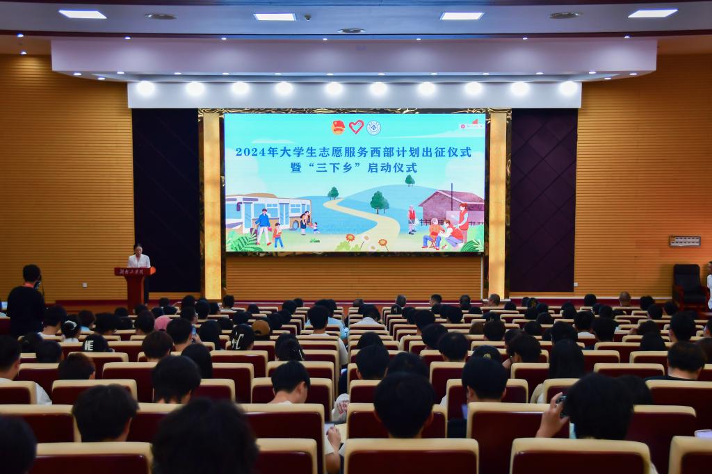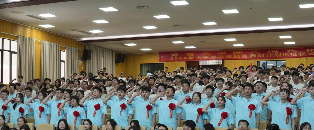 6月28日下午,我校2024年大学生志愿服务西部计划出征仪式暨“三下乡”活动启动仪式在明翰报告厅举行。党委委员、副校长刘龙昌出席活动并讲话。学校党委宣传部、学工部、教务处、招就处、财务处负责人,各学院党委副书记、团委书记,校团委老师,2024年西部计划志愿者、“三下乡”指导老师及志愿者代表300余人参加活动。活动由校团委书记毛娜主持。