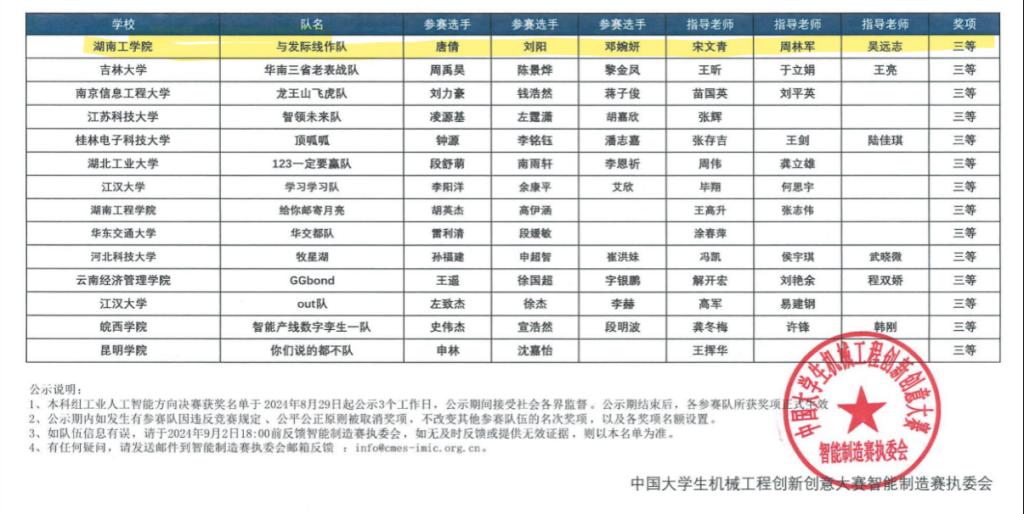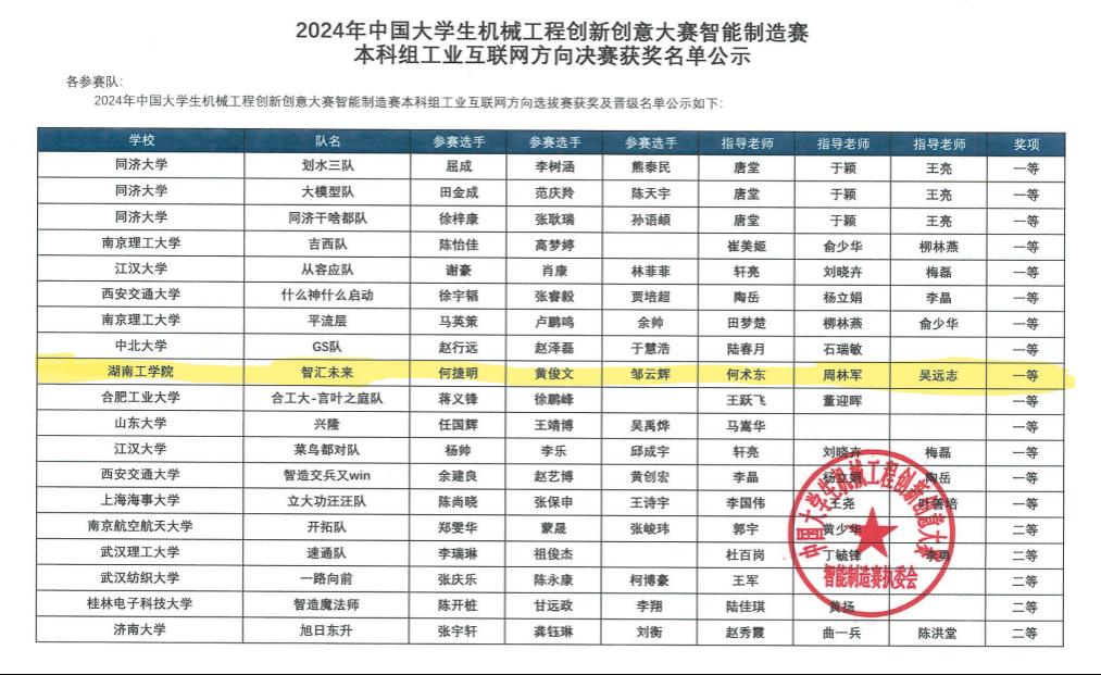 中国大学生机械工程创新创意大赛——智能制造赛由中国机械工程学会主办,受教育部高等学校机械类专业教学指导委员会、材料类专业教学指导委员会和工业工程类专业教学指导委员会指导。自2018年创办以来,该赛事每年举办一届,旨在推动智能制造领域先进理念的传播与技术应用,树立智能制造人才教育的风向标,加快培养符合产业需求的创新型复合人才和系统型人才,提升智能制造领域的创新能力,推动中国智能制造的可持续发展。本届大赛吸引了全国285所高校的1927支代表队共5865名选手参与。在湖南省选拔赛中,智能制造与机械工程学院也表现不俗,获得一等奖、二等奖和三等奖各1项。