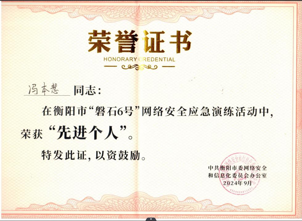 我校冯本慧老师因其在应急演练中的良好表现,获得了衡阳市”磐石6号”网络安全应急演练先进个人的荣誉称号。(图文/冯本慧 审稿人/一审:彭婷 二审:彭国柱 三审:肖中云)