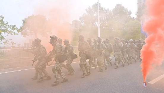 随着教官一声令下,新生们身着迷彩服,全副武装,踏上了征途。在遭遇“化学武器袭击”时,他们迅速穿戴好防护装备,有序通过“染毒地带”,展现了良好的心理素质和应对能力。沿途,新生们还经历了敌机侦察、炮火封锁区等模拟战术环境,展现了坚韧不拔的战斗精神。