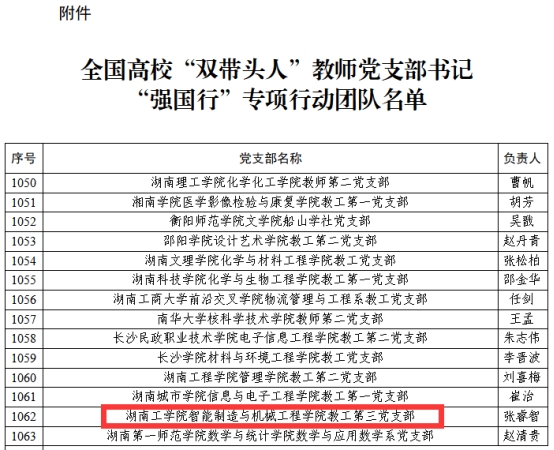近日,教育部公布全国高校“双带头人”教师党支部书记“强国行”专项行动团队名单,我校智能制造与机械工程学院教工第三党支部成功入选。
