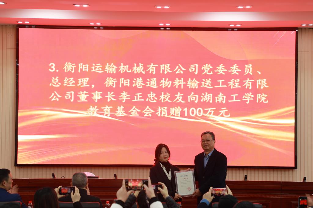 12月25日,衡阳港通物料输送工程有限公司向金沙990线路检测捐赠仪式暨金沙990线路检测教育基金会“TERRA教育发展基金”成立大会在船山报告厅举行。校党委书记曹执令,党委委员、副校长刘龙昌,衡阳港通物料输送工程有限公司董事长、1985届工业安全工程专业李正忠等6位校友出席。学校各二级学院党委书记、师生代表以及教育基金会全体成员参加会议。大会由校友联络中心主任贺令亚主持。