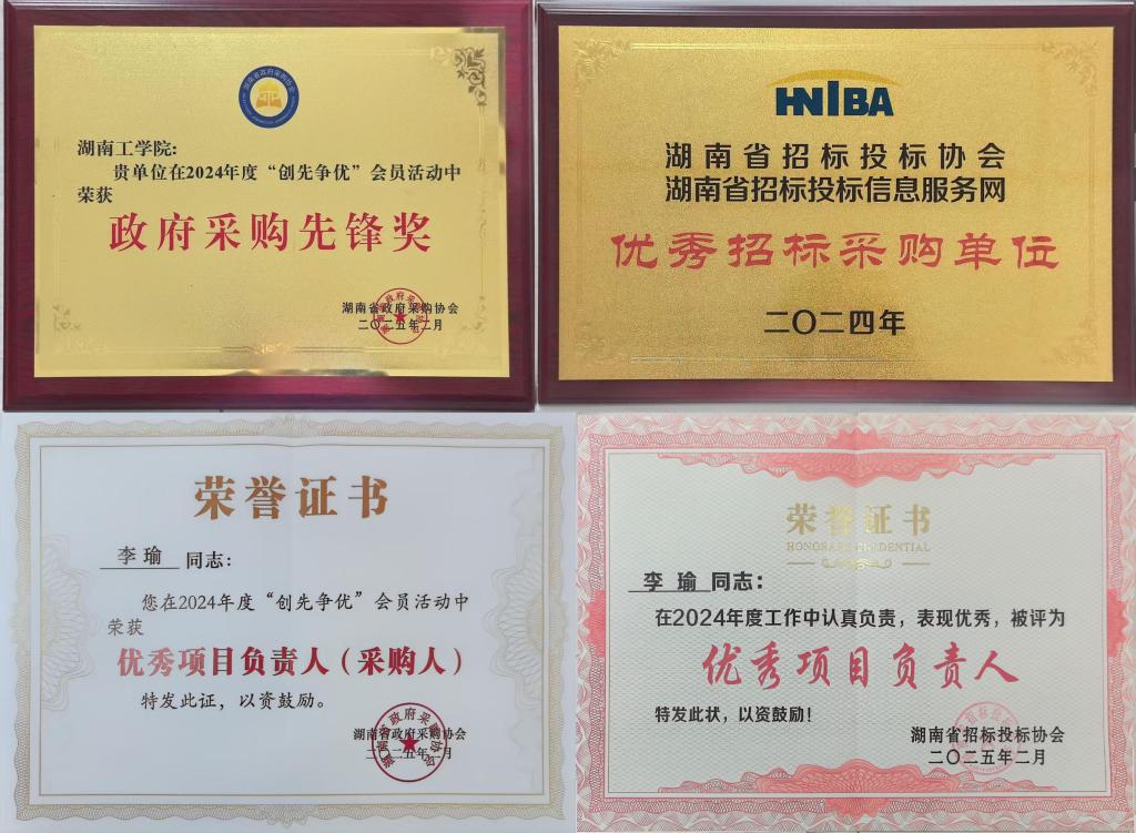 此外,我校招投标管理办公室李瑜同时荣获了招标投标协会“2024年度优秀项目负责人”称号和湖南省政府采购协会“2024年度优秀采购人”荣誉。